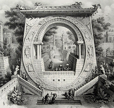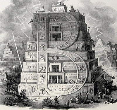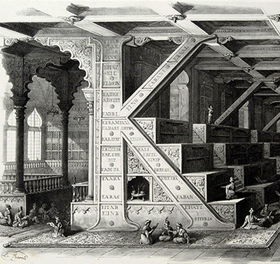 The year is 1839 and the city is Bologna, Italy the decorative artist Antonio Basoli publishes his “Pictorial Alphabet or a collection of pictorial thoughts composed of objects beginning with the individual letters of the alphabet”. This was an album of twenty-five lovely lithographs, each one featuring an alphabetical character cast in some fantastic architectural form.