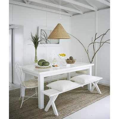 love those white fluffy cushions on the white bench!
