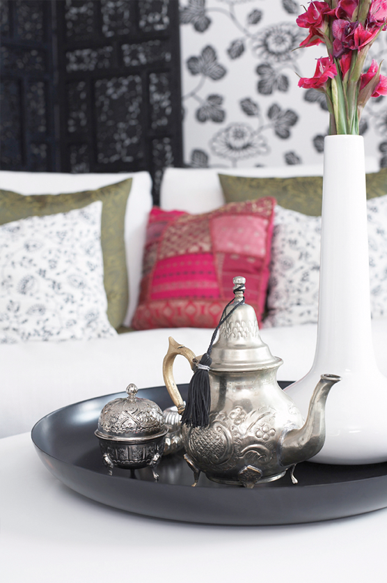 Основната идея тук е изградена на базата на белите стени, черни мебели и страхотна декорация. Много ми харесва Ориенталския стил тук и особено малката сребърна каничка от първата снимка.
