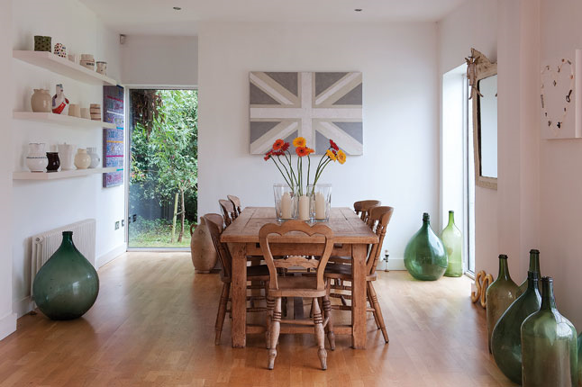 What I particularly like is that there is plenty of light all over the house and as a favorite decorative element I would choose these big green bottles in the dining room.