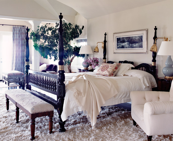Oh my! I've had my breath taken away no less than 3 times! That statue with the necklaces is mesmerizing. The worn blue cabinet is to die for. And that BEDROOM! Give me an indoor tree and a huge shaggy white rug and I'll be a happy girl. :)