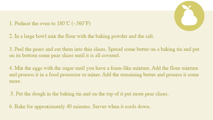 Finally I’m back after a really busy week at work. And what is the best way to celebrate … I think with a nice cake could be a good idea. And I have a surprise for you… a Czech cake with pears… Czech because currently I am in Czech Republic; with pears, because now it is their season and you can be sure that the cake is very easy to do… it will take only 1 hour of your life… So let’s start with the ingredients that you will need: