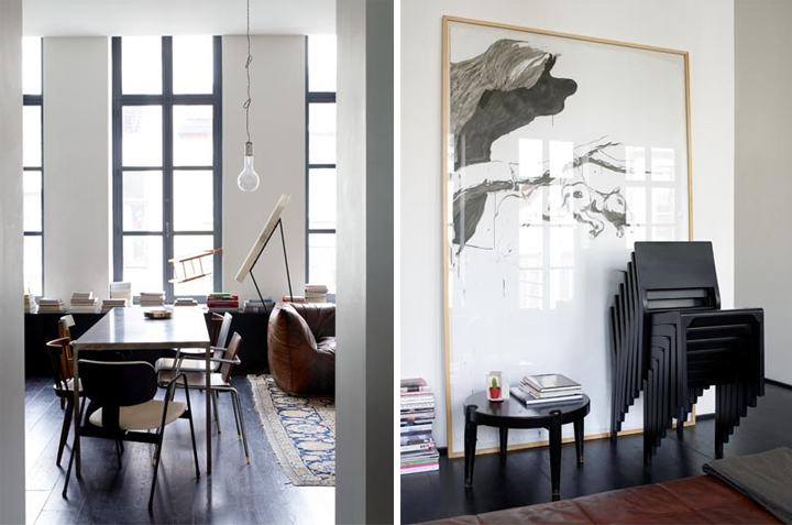 This is totally my style! Perfect mix of black and white, warm touches everywhere thanks to de vintage pieces, huge art… I could live there!
