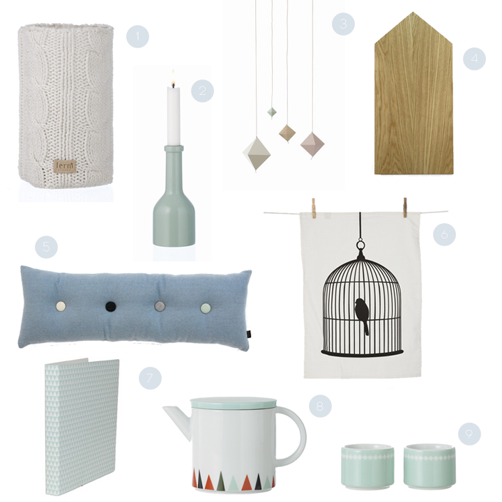 1. knitted vase 2. candleholder 3. cubes on string 4. cutting board 5. button cushion blue 6. birdcage tea towel 7. ring binder 8. teapot 9. egg cups