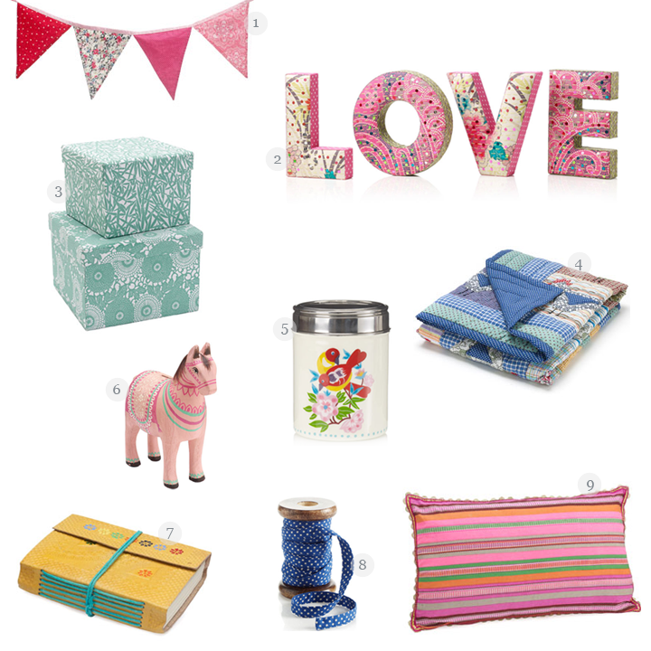 1. pink bunting 2. love letters 3. set of 2 hand-printed duck egg blue storage boxes 4. chicken cot size quilt 5. cream bird canister 6. pink horse money box 7. yellow leather note book 8. blue bobbin & binding 10m 9. striped cushion cover