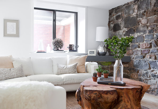 This wonderful light apartment impressed me with the stunning combination of white and natural elements. The wood as a detail is perfectly combined with the stone walls, contrasts very well to the white walls and textile and brings coziness.