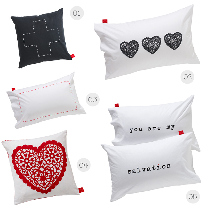01. canvas cushion – cross 02. pillowcase – hearts 03. pillowcase – stitch 04. scatter cushion – heart 05. pillowcase – you are my salvation