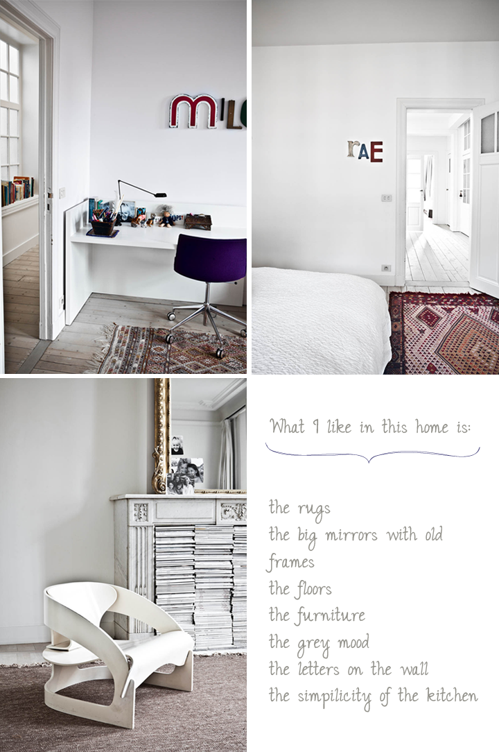 I found this lovely home in Milk Magazine and I wanted to share it with you. I thought that probably you would like the old mirrors with pretty frames, or the floors (after those stylish floors from yesterday), and the wooden furniture of course. I really like the way how in that little bit greyish pictures there are added colorful textiles as an accent.