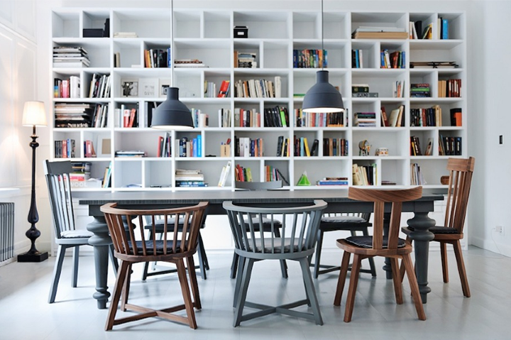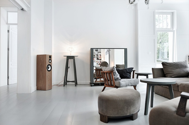This minimalist interior is fantastic. The full wall bookcases are extremely intruiging. I always dreamed of having one and of course having read all the books on it (like Mr.Darcy :) )