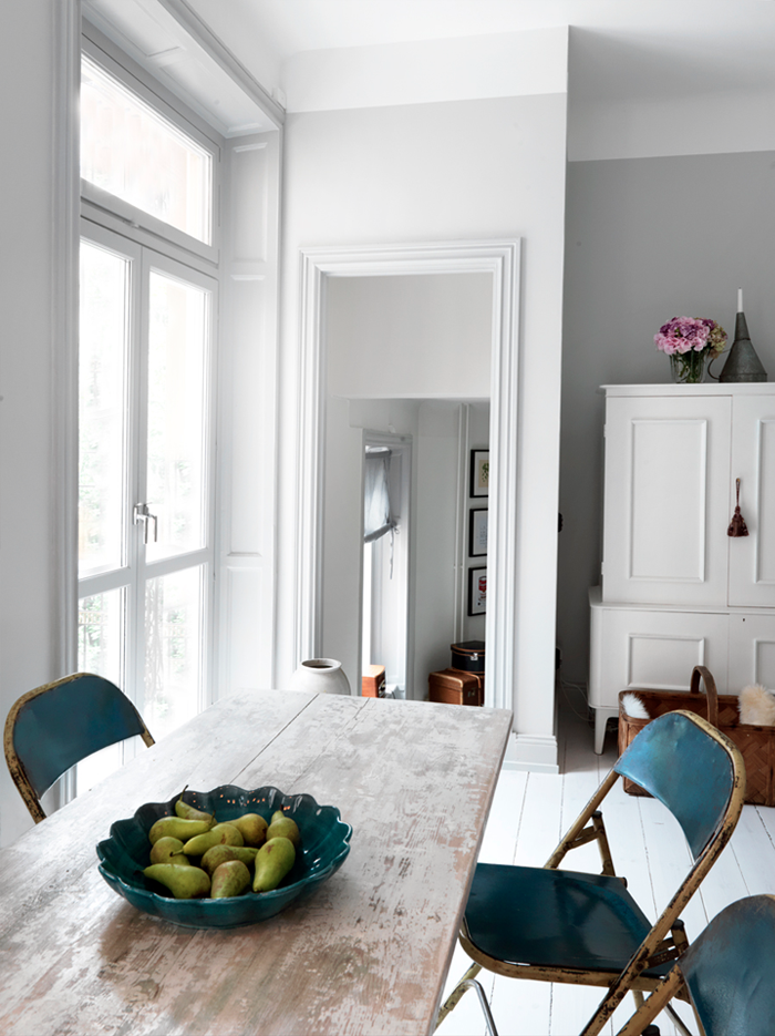 What makes it so interesting is the fact that it collects in one place both modern details and beautiful old elements. The kitchen furniture is from IKEA, but it is refreshed with various white faience tiles and gorgeous retro tap. The accent in the dining room are four vintage turquoise chairs which contrast perfectly with the white floor and walls which are in different shades of grey.
