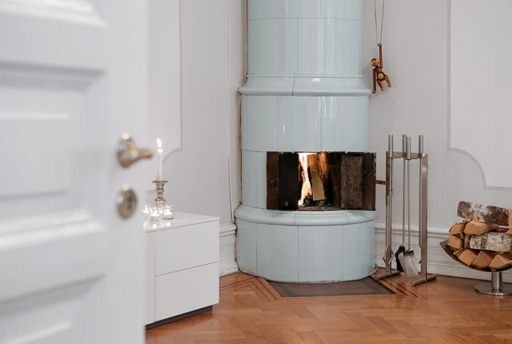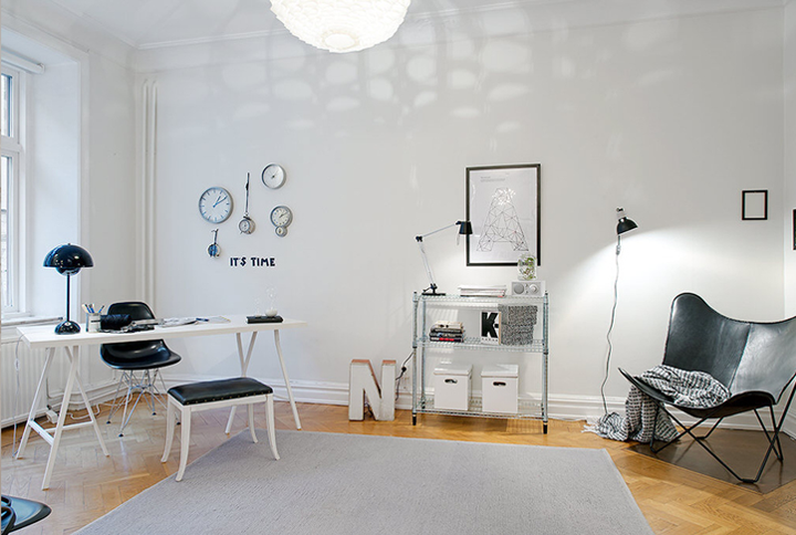 I chose to show you this Swedish apartment not only because it is beautiful, but also because there is a room inside which I really like – the home office. I like it a lot because of its simple yet practical and beautiful concepts. For example the way the desk is placed is original and allows the light to be concentrated on the working area where you need it.