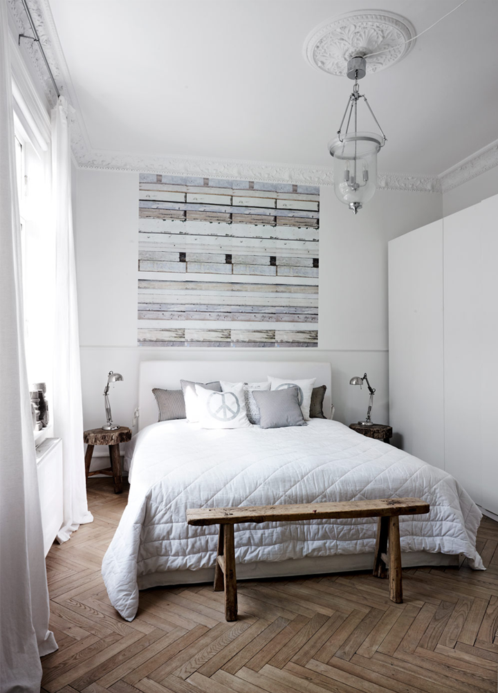 Този чудесен датски апартамент представлява прекрасна смесица от скандинавски стил, шаби чик, страхотни мебели от дърво, величествени полилеи и винтидж аксесоари. Патината и белият цвят създават изключително красив контраст.