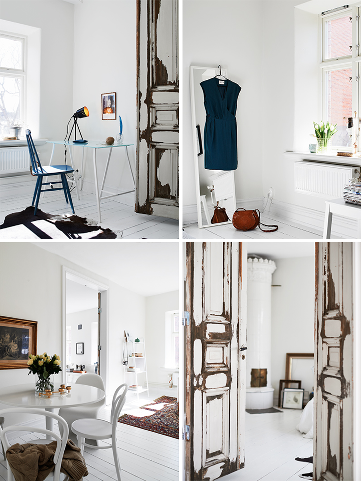 White, patina and blue. These are the most precise words that describe this gorgeous, light apartment. It is located in Sweden and is typical example of the Scandinavian design. Despite that you can see there two of my favorite trends – clean and simple color palette and displaying of various collections. Would it be a collection of old cameras, items or frames – it doesn’t really matter. Also really impressive is the old door, which divides the bedroom and the living room.