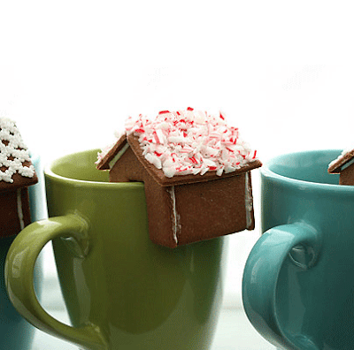 Tiny gingerbread houses that are meant to be perched on the edge of a mug of hot chocolate. What a wonderful idea, right? It came to Megan from notMartha blog. Check it out here.