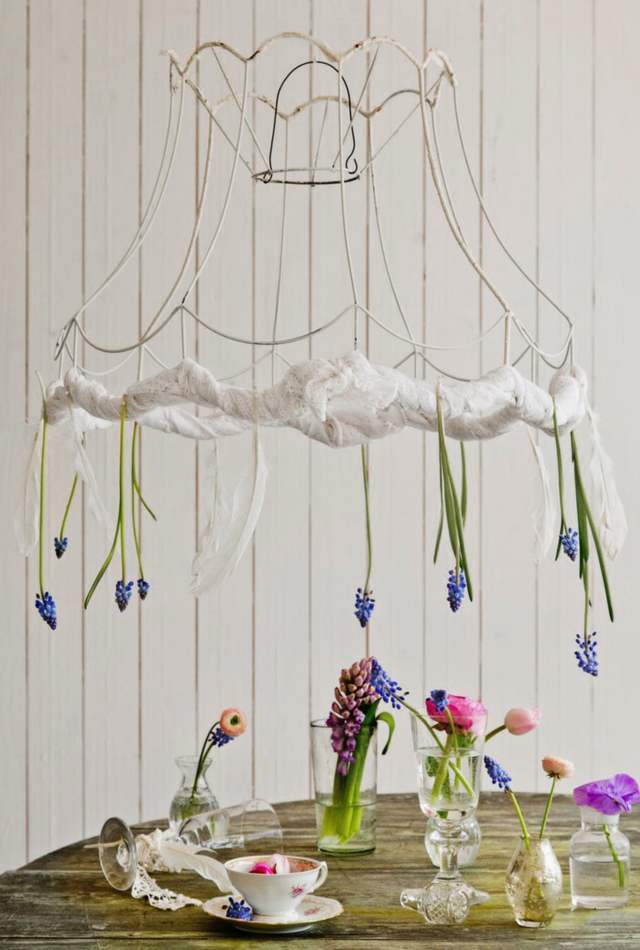 Finally Friday is here. I don’t know about you, but I’ve had a really busy week and I can’t wait for the weekend to come. And because we all still have to work, here I have for you a little inspiration: wonderful spring-summer table decoration. I really like the combination of flowers and feathers and I found it really lovely to decorate a chandelier above the table.