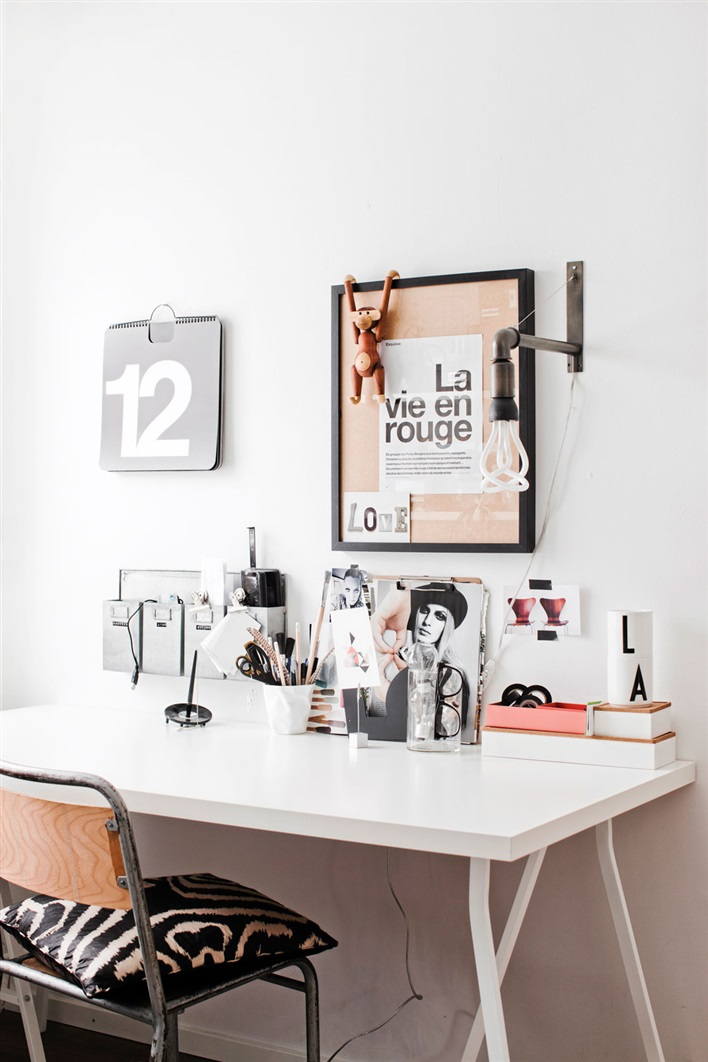 I was quite impressed by this beautiful home office today. It’s a bit messy, but I like it, it has IKEA furniture mixed with vintage items from the flea market and gorgeous color palette in white, black and brown coming from the wood. But not only the home office is impressive there – also take a look at the living area where you will find a beautiful “Barcelona” chair, cute dog and plenty of textures. Simple, cozy and beautiful.